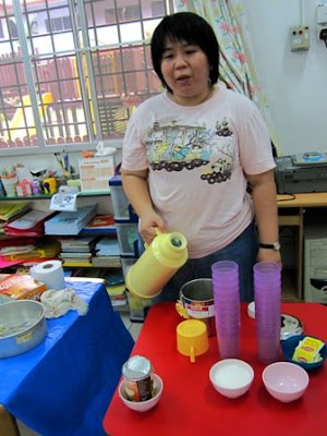 我负责将蛋糕切块,Ms Lee就快手快脚地切除烤焦的部分。